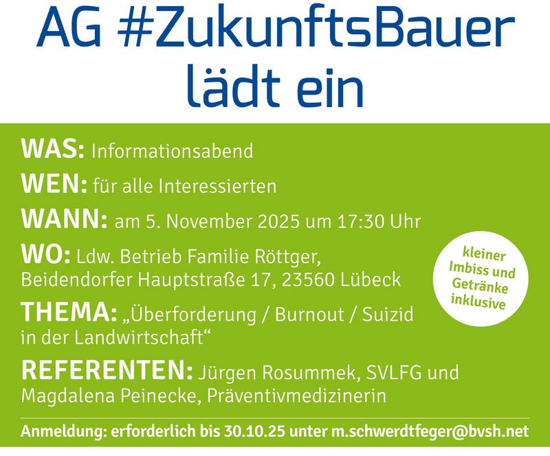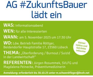 Die AG #ZukunftsBauer des Bauernverbandes Schleswig-Holstein lädt alle Interessierten sehr herzlich zu einem Informationsabend zu dem Thema "Überforderung, Burnout, Suizid in der Landwirtschaft" nach Lübeck auf den Betrieb der Familie Röttger ein.