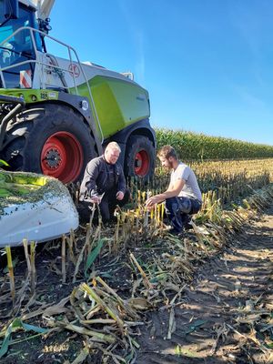 Auf den Feldern rund um den Bensenhof steht druschreifer Mais. Mit einem sogenannten Feldhäcksler werden die gesamten Pflanzen geerntet und im Innenraum der Maschine zerkleinert. Der optimale Trockenmassegehalt der Pflanze beträgt zwischen 30 und 35%. Die Schnittlänge der gehäckselten Maispflanze liegt bei maximal einem Zentimeter. Das Häckselgut wird sofort auf einen neben dem Häcksler fahrenden Trecker mit Anhänger geladen. Der Maishäcksler hat, anders als der Mähdrescher, keinen Korntank im Innenraum der Maschine. Deshalb fahren während der Maisernte viel mehr Trecker mit Anhänger zwischen dem Feld und dem Hof hin und her.