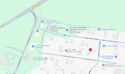 Der Weg zu uns führt über die B 201 Kappeln-Husum. Biegen Sie an der Ampel bei der team-Tankstelle von der Bundesstraße in das Gewerbegebiet Klappschau/St. Jürgen ab. Hinter der Tankstelle sofort wieder links in die Marie-Curie-Straße und an der nächsten Kreuzung rechts in die Heinrich-Hertz-Straße abbiegen. An der nächsten Kreuzung rechts mündet die Lise-Meitner-Straße ein. Die Geschäftsstelle befindet sich direkt an dieser Kreuzung rechts. Vor dem L-förmigen Gebäude, das wir uns mit dem Landwirtschaftlichen Buchführungsverband teilen, stehen ausreichend Parkplätze zur Verfügung.